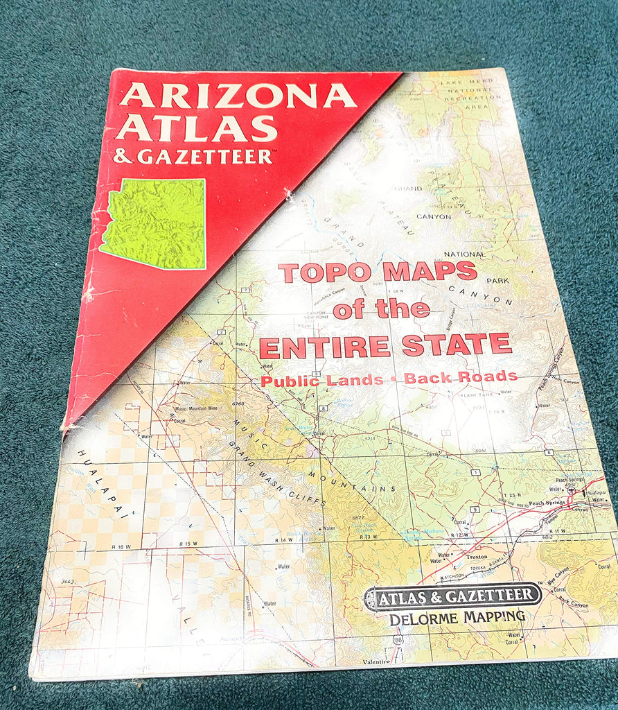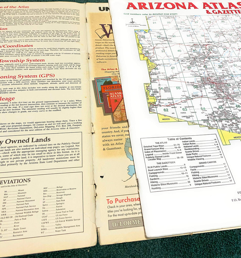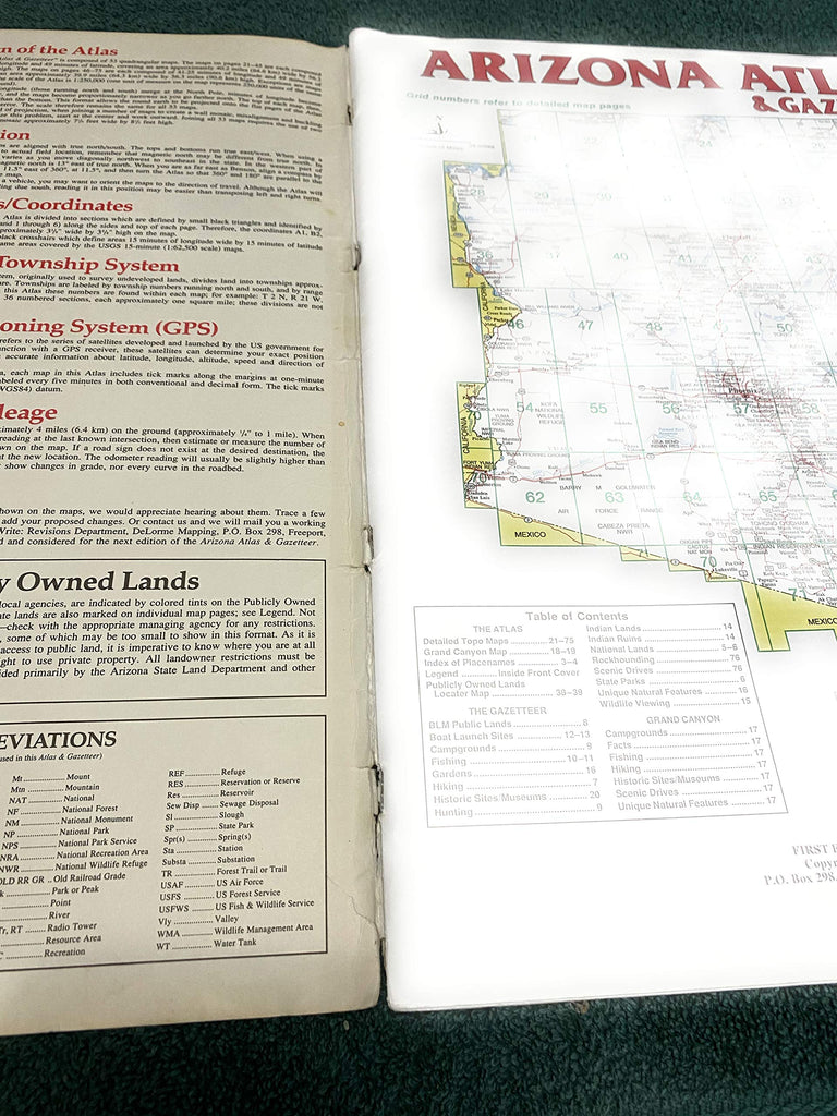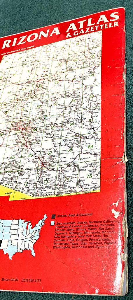 From De Lorme. New! Enhanced Topography. Topo Maps of the Entire State. * Back Roads * Public Lands. 76 pages. Size: approx. 11" x 15 3/4". ISBN 089933-263-3. The DeLorme Arizona Atlas & Gazetteer gives you an enormous amount of information that some normal, fold-out maps don't provide. You'll be able to plan hikes, backpacking trips, river trips, fishing excursions, hunting expeditions, bike rides, and more with the amount of detail that these topo maps include. In addition to elevations, you get symbols for everything you would need in National Forest lands to locations of monuments. It's a wealth of Arizona information for the avid traveler.Back roads, dirt roads, and trails Elevation contours Remote lakes and streams Boat ramps Public lands for recreation Land use/land cover Trailheads Campgrounds Hunting and fishing spots. Note that we have listed several other De Lorme Atlas & Gazetteers; if you buy more than one we combine orders and refund all shipping except for one.