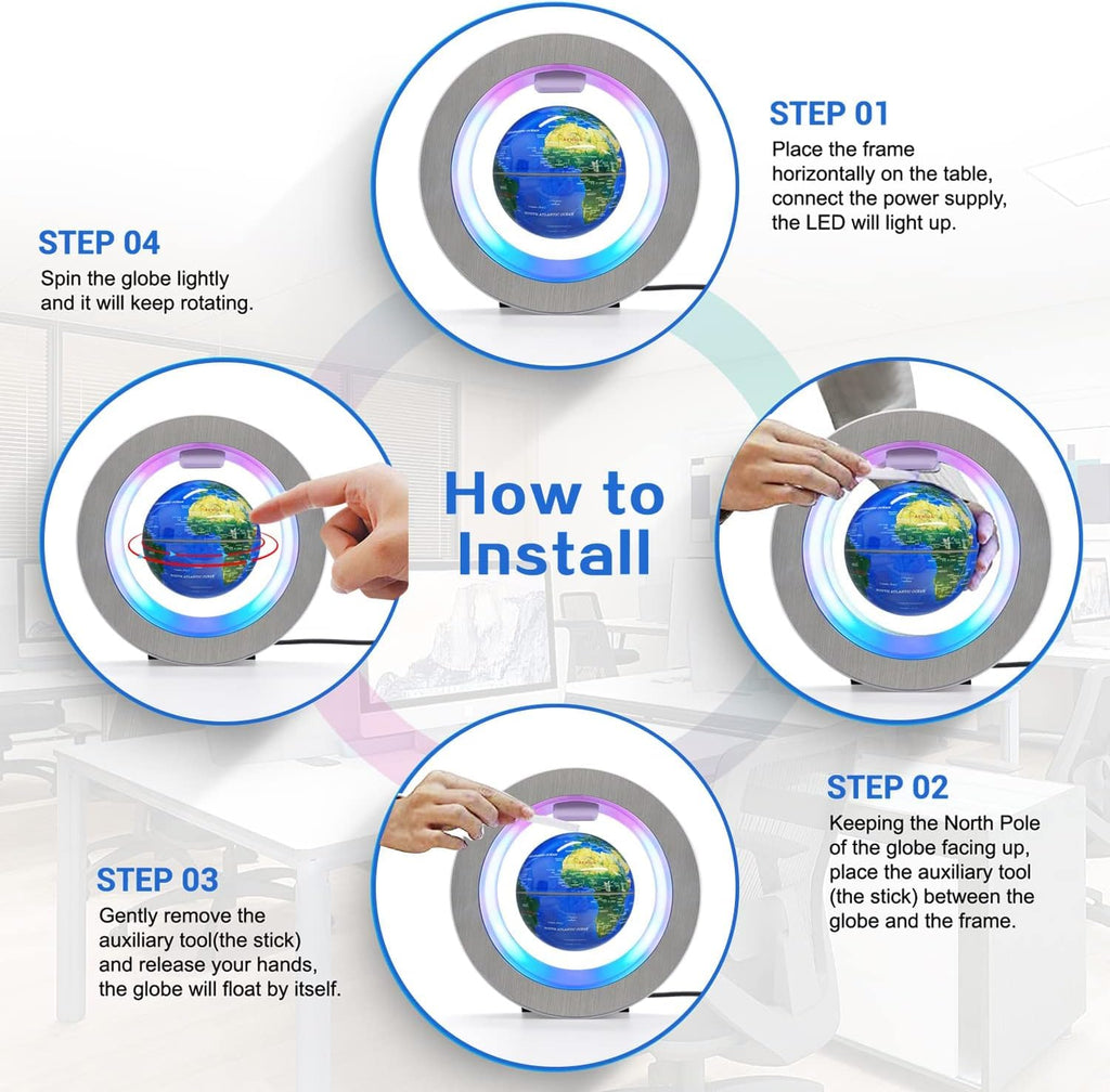 • EASY TO INSTALL: Our floating globe is operated by an electronically controlled magnet system. Plug in, install the globe using the auxiliary tool (included), feel the suction once you get to the point, remove the tool and release your hand, the globe will float by itself.
