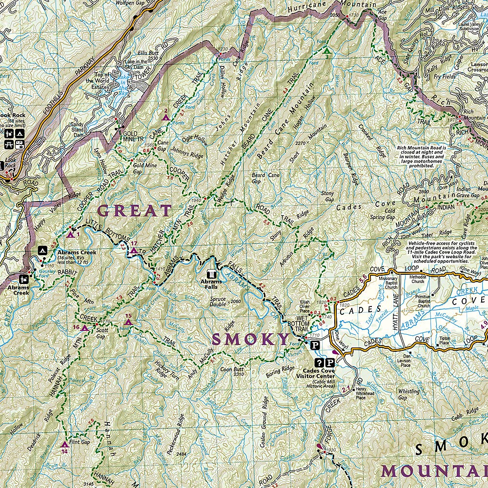 With over 800 miles of mapped trails, the Great Smoky Mountains National Park map can guide you off the beaten path and back again. The clearly marked trails include mileages between intersections. The map base includes contour lines and elevations for summits, passes, and many lakes. Some of the many recreation features include: visitor centers, campgrounds, trail shelters, trailheads, boat ramps, scenic overlooks, interpretive trails, and quiet walkways.
