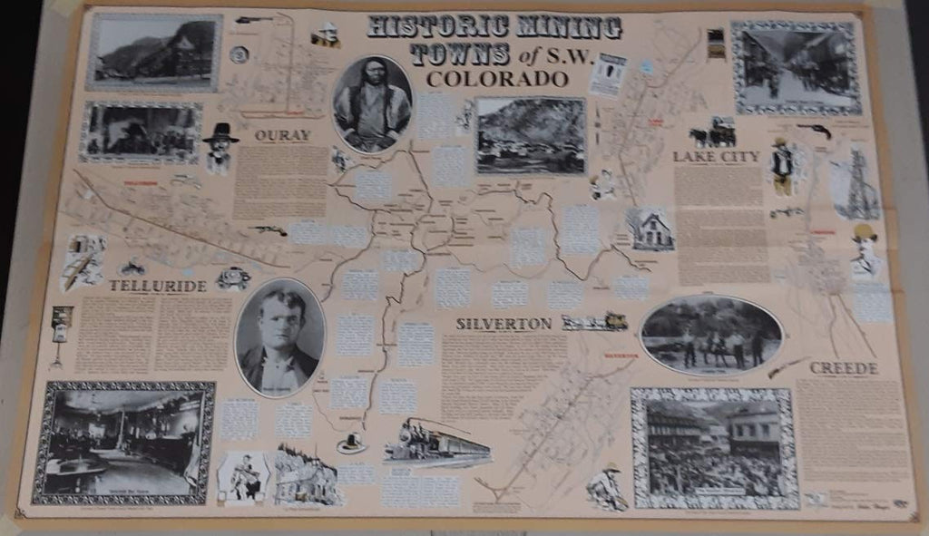 Two sided LAMINATED poster (sent rolled, not folded) showing the Historic Mining Towns of Southwestern Colorado and Jeep Trails of the San Juan Mountains Region
