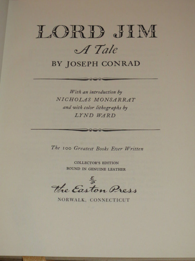 Should read: This is a book originally sold by The Easton Press, 47 Richards Avenue, Norwalk, CT 06857 as part of its "100 Greatest Books Ever Written Collector's Edition" collection which then evolved into "The Greatest Books Ever Written" collection. Many of the books carry a 1979 copyright but may have been printed in different years with different cover art. This is a leather-bound volume featuring 22kt gold accents, illustrations, moire fabric endsheets, gilded page ends, and a satin-ribbon page marker. Lord Jim is a novel by Joseph Conrad originally published as a serial in Blackwood's Magazine from October 1899 to November 1900. An early and primary event in the story is the abandonment of a passenger ship in distress by its crew, including a young British seaman named Jim. He is publicly censured for this action and the novel follows his later attempts at coming to terms with himself and his past.
