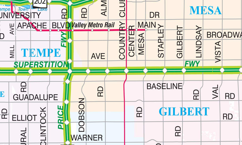 View the entire Valley of the Sun metropolitan area on a single desktop-sized gloss laminated sheet showing major (arterial) streets, freeways, and expressways, as well as locating communities, river channels, canals, and railways. It is popular for general reference and for the current and planned highway system. The colors are used to show the incorporated cities, making it easy to locate the official area of each city. An inset shows the region of downtown Phoenix and Sky Harbor Airport in greater detail.
