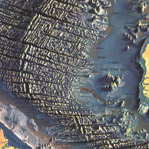 "This new map of the Atlantic charts an area of exploding promise and knowledge - and a continuing challenge to cartographers." This striking portrait of the Atlantic Ocean seafloor was published in October 1968 as a supplemental map of the Atlantic and displays the ocean floor with breathtaking detail.