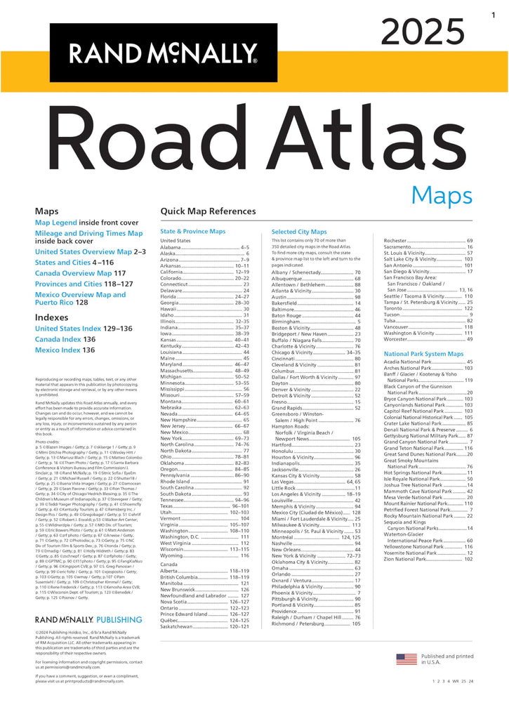 The Rand McNally Road Atlas has been the essential, trusted tool for road travelers for more than 100 years. This updated 2025 edition contains maps of every U.S. state and Canadian province, an overview map of Mexico, and detailed inset maps of 375 cities and 28 national parks. Road construction and conditions contact information for every state and province is conveniently located above the maps. The atlas also contains a Mileage and Driving Times Map showing distance and approximate driving times between hundreds of cities.