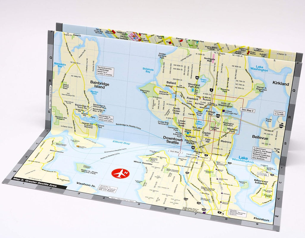 The Red Map Seattle helps you find the very best restaurants, shopping, landmarks, and museums from the city known for coffee and grunge. The guide covers the area from the University of Washington, Lake Union, and Capitol Hill to Pike Place Market, Downtown, and Pioneer Square. On Elliott Bay you'll see the attractions of Bainbridge Island, Ballard, and Fremont. The map is matte-laminated which makes it easy to read in daylight.