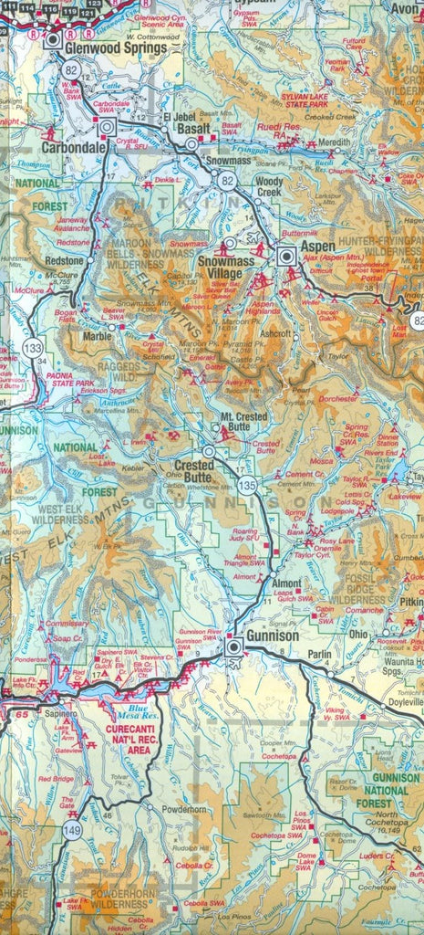 Detailed travel map ? Interstates, exit numbers, highways, and most local maintained roads. Topographic contours each 1,000 feet. Color shaded each 2,000 feet above 6,000 feet. Features include national forests, wilderness, campgrounds, parks, state wildlife areas, ski areas, mining districts, points of interest, and more. New 2019 Edition includes GPS coordinates and multiple updates.
