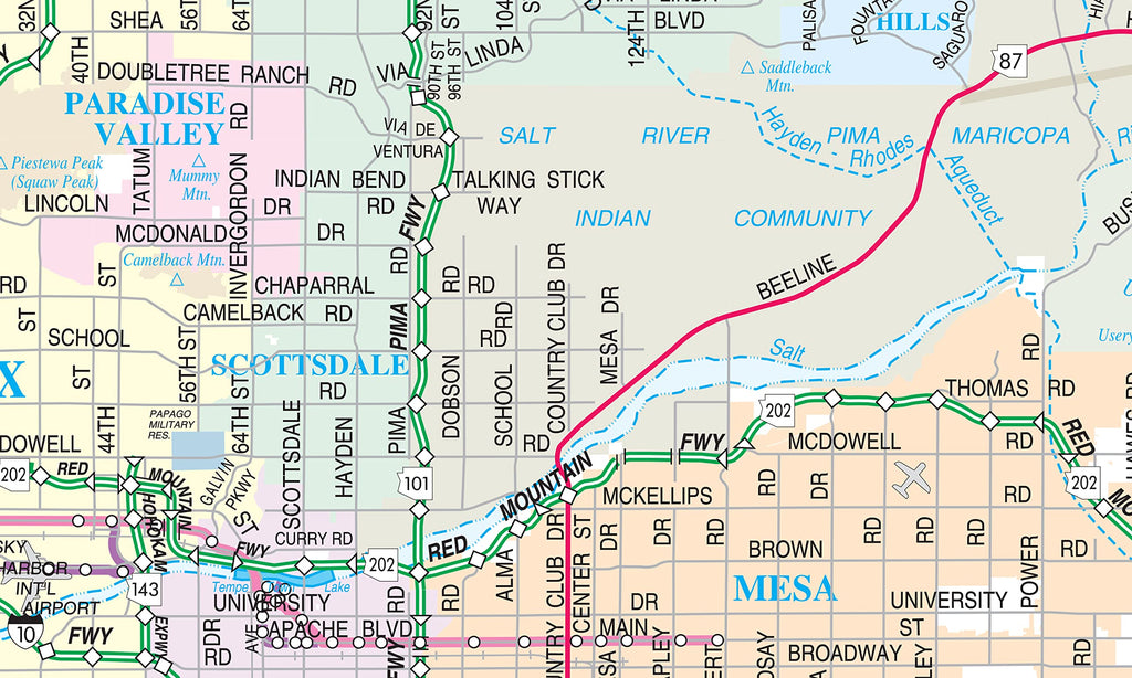 This wall map shows major (arterial) streets, rail and lightrail, and highways for the central region of the State of Arizona. Centered on the Phoenix Metropolitan area, it also shows most of Maricopa, Pinal, and parts of Gila and Yavapai counties. This is the perfect map to plan and track growing commercial markets in this economic hub of the Southwest.