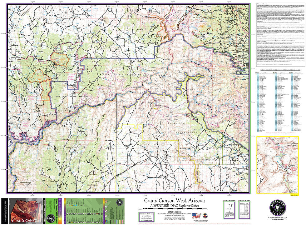 The Grand Canyon West Map covers the areas which are west of Tusayan & Samp Point to the Lone Mountain & Mount Trumbull areas (Colorado River miles 102 through 212). Included in this map are the Mount Logan, Mount Trumbull, & Kanab Creek Wilderness Areas as well as the eastern portion of the Grand Canyon Parashant National Monument & the northern tribal lands of the Havasupai & Hualapai Indian Nation Reservations.
