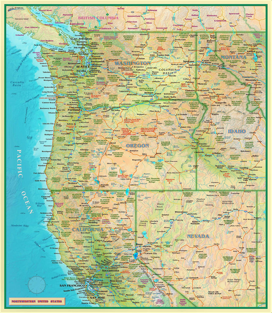 Compart Maps Northwestern United States Full-Size Wall Map includes Washington, Oregon, Northern California, Northern Nevada, and Western Idaho at 32"×37". This full-sized wall map features dry-erase lamination, a specialty laminate that allows for dry-erase markers to be used on the finished print and erased as desired for locations, areas, and zones.
