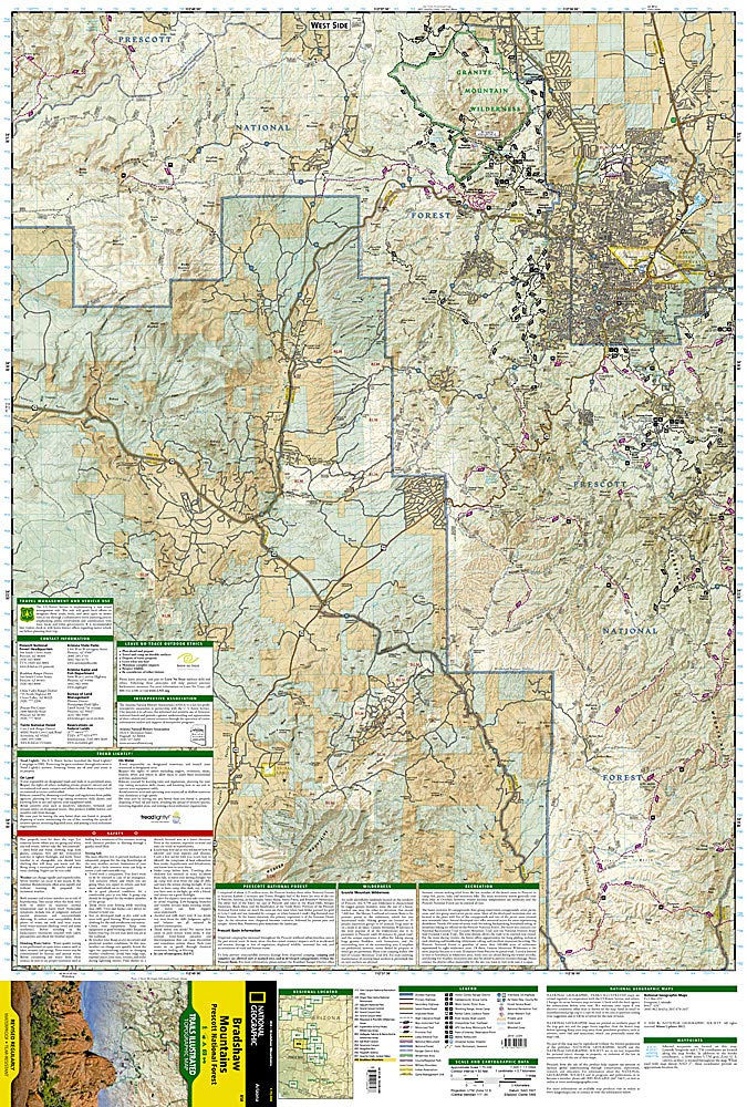 Created in partnership with the U.S. Forest Service and others, National Geographic's Trails Illustrated Map of Bradshaw Mountains is an essential travel companion for novice and experienced outdoor enthusiasts alike exploring the area. Recreational lands around Prescott are shown with unparalleled detail in this expertly researched map. Coverage includes Prescott National Forest, Granite Mountain and Castle Creek Wilderness areas, Agua Fria National Monument, Hayfield Draw and Alto Pitt OHV Areas, Lynx Lake and a small segment of the Verde Wild and Scenic River as well as the municipalities of Prescott and Prescott Valley.