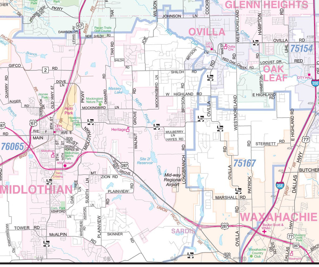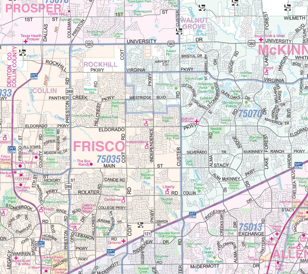 Updated for 2018 - sharp and functional wall map from Metro Maps, sold and distributed by Wide World Maps & More. This 48" x 64" wall map offers the best of both worlds with a unique combination of detail and coverage that cannot be imitated by internet and app maps. Extensive coverage including all of Dallas and Tarrant Counties, as well as the booming communities of Collin, Denton, and other adjacent counties. Coverage as far north as the rapidly growing city of Melissa, Midlothian to the south, Rockwall and beyond to the east, and all the way to Lake Weatherford in the west. Comprehensive detail showing every street, with all major roads labeled - including 'Farm to Market' county designations. All toll roads, airports, passenger and freight rail lines, hospitals, colleges, parks, high schools, major points of interest, rivers, major terrain features, and current zip codes are all clearly indicated. This version is paper, providing a discounted alternative if lamination is not needed.