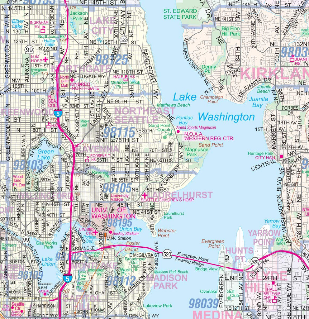 Featuring airports, rail lines (including Sounder, Link, and Amtrak routes), ferry lines. hospitals, colleges, parks, high schools, points of interest (including Boeing facilities and Microsoft HQ, etc), lakes, rivers and landscape features.