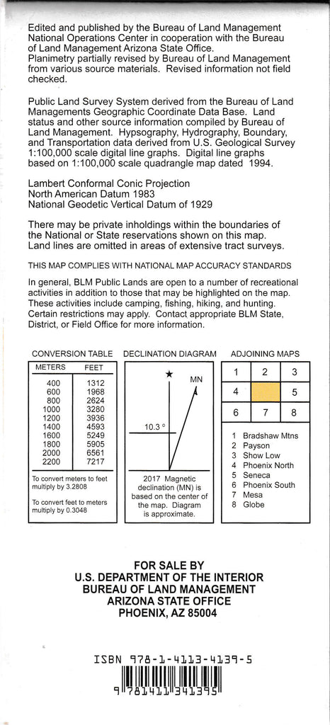 Differentiates between public and private land, and also among the various agencies who manage the public lands. The map shows Tonto National Forest, McDowell Mountain County Regional Park, and four wilderness areas. Explore the Four Peaks Wilderness and the Superstition Mountains Wilderness. Scenic driving on Highway 88 from Apache Junction to Roosevelt Lake. Camping, backpacking, hiking, and regulated OHV use in the national forest. Enjoy boating, fishing, swimming, camping, and picnicking at some of the four reservoir lakes along Highway 88. Map is useful for AZ Hunting Units 21, 22, 23, and 24B. Scale 1:100,000. 2017.
