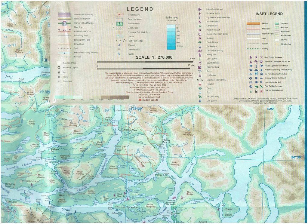 One of North America's great wonders is the majestic mountainous island off the west coast of British Columbia. When Capt. George Vancouver first arrived in 1790 something, the Spanish were already here, mapping. The Spanish withdrew after George showed them his Letters Patent and various islands were named in honor of members of both surveying teams. Vancouver's Island eventually became its own crown colony, then merged with the emerging colony of British Columbia and hence became part of the expansion of Canada from sea to sea in 1871. Now, the island is the home of BC's capital, Victoria, and is a largely rural and resource-based entity joined to the mainland by ferries. The island offers Victorian architecture in Victoria, painted murals in Chemainus, a logging museum in Duncan, great vistas of pristine beaches in Tofino, an endurance contest in the West Coast Trail, and a rustic existence far from the madding crowd just about anywhere - all on our map.