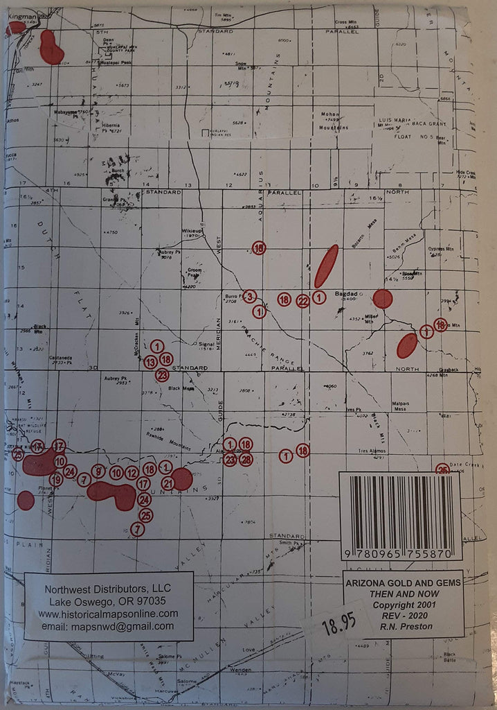 Arizona Gold and Gems: Then and Now is a package of five maps, measuring 6.5″ × 9.5″ printed on both sides. The very readable historical maps measure 17.5″ × 23″ when unfolded. Maps have been reproduced from authentic documents on file from archival sources — 100 years of reported gold and gems occurrences included; red numbered guide shows 34 gem site locations. This package includes: