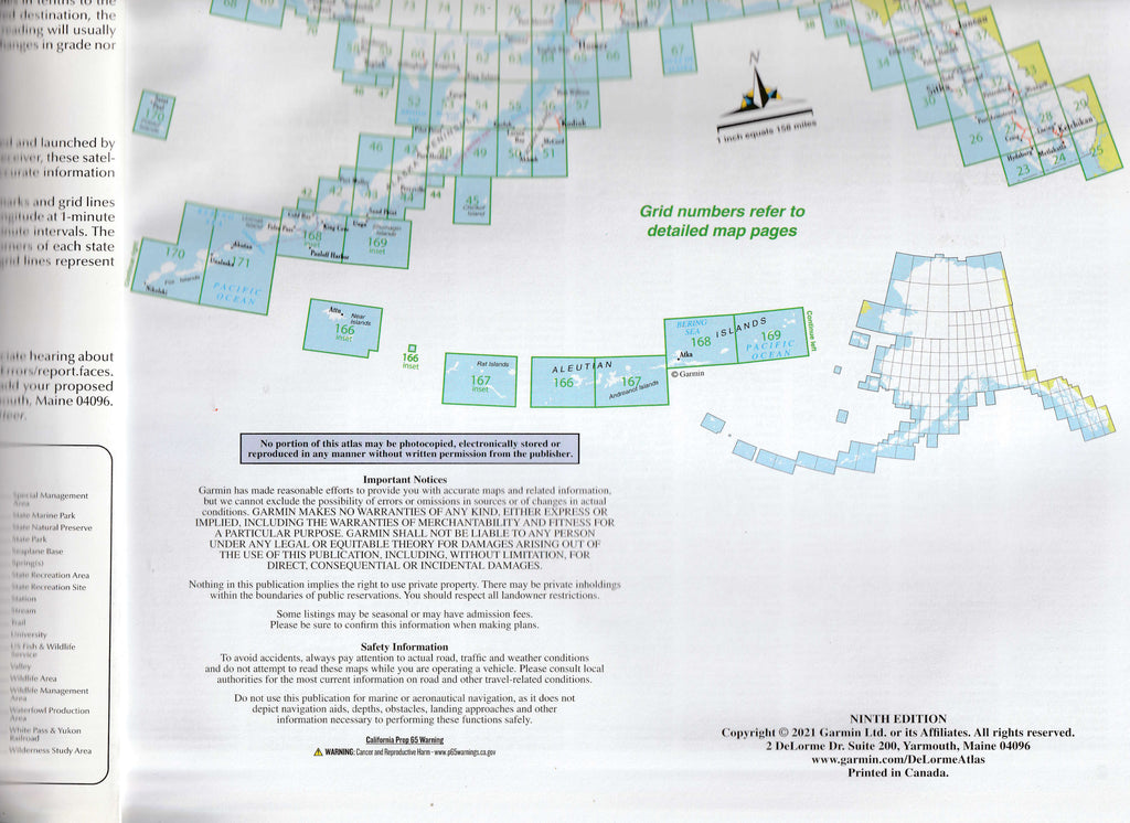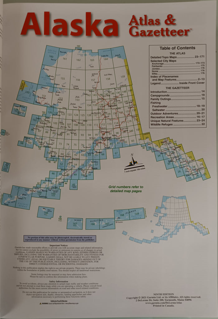 The Alaska Atlas & Gazetteer includes 149 quadrangular maps covering the entire state, as well as several city maps. The scale of the maps is 1:350,000 for pages 23-149 and 1:710,000 for pages 150-171 (one unit of measure on the map represents 350,000 or 710,000 units respectively, of the same measure on the ground).