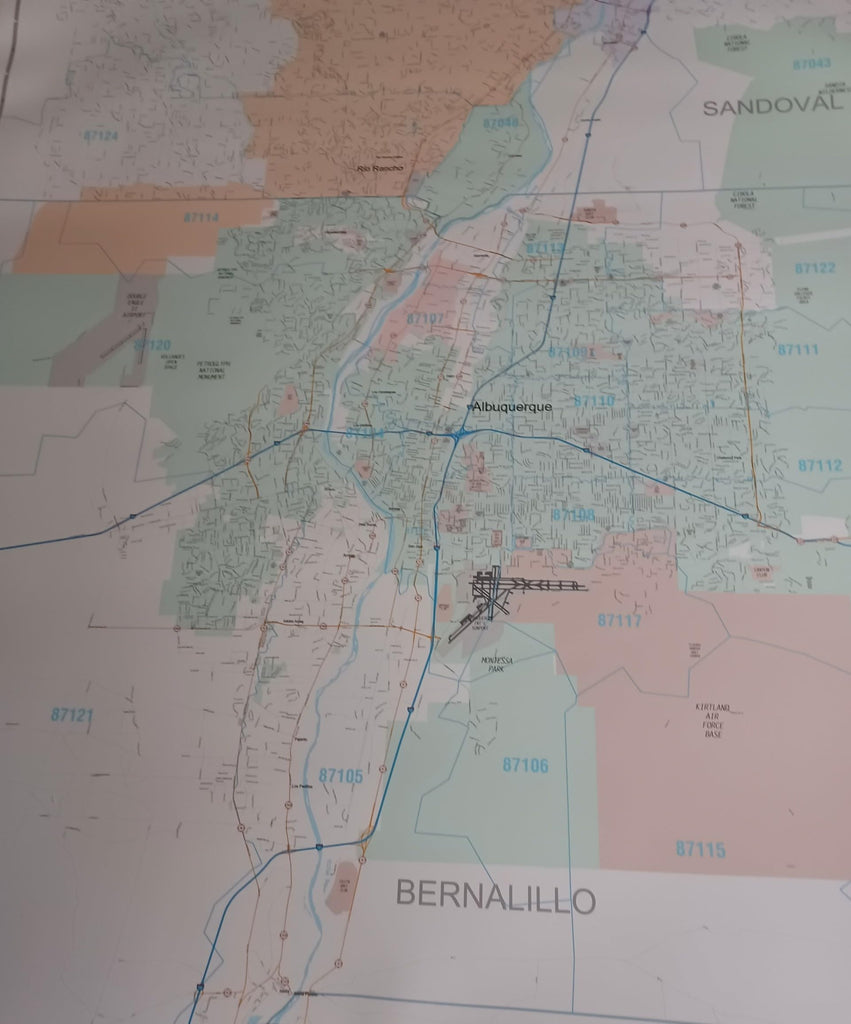 49 x 64 inches. Laminated. Flat map, tubed for shipping. This map of Albuquerque, Bernalillo and Rio Rancho areas of New Mexico shows ZIP code boundaries overlaid on a detailed highways and roads wall map. Ideal for planning of deliveries, home services, sales territories, real estate and much more. Base map features include all roads with major roads and highways labelled; neighborhood names; railways; and high level land use such as park and recreation areas, industrial areas and hospitals.