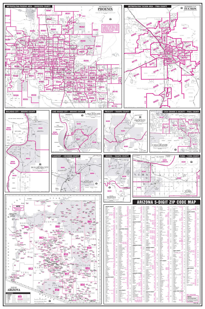 The Arizona 5-Digit ZIP Code Map Full-Size Dry Erase Laminated Wall Map is updated to show the latest changes from the U.S. Postal Service. This statewide wall map is actually several maps in one. It includes a state road map that uses a pink overprint to clearly show 3-digit ZIP code divisions and 5-digit ZIP codes for single ZIP code communities. Multiple ZIP code communities have inset maps to clearly show 5-digit ZIP code divisions. These inset maps cover metropolitan Phoenix, metropolitan Tucson, Bullhead City, Lake Havasu City, Prescott, Casa Grande and vicinity, Flagstaff, Sedona, and Yuma. Also included is a comprehensive county/city ZIP code listing as a handy alphabetical reference. Use this wall map to quickly identify ZIP codes for multiple office tasks.