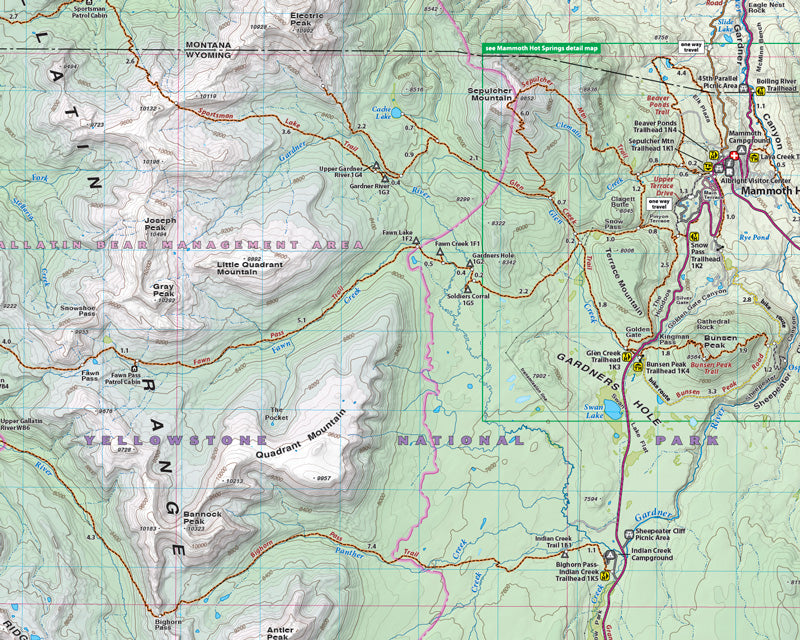 This Yellowstone North map shows all recreation sites, including backcountry campsites (with the site’s name and park code). It includes 1:45,000 scale detail maps for Mammoth Hot Springs, Tower / Roosevelt, and Canyon Village.