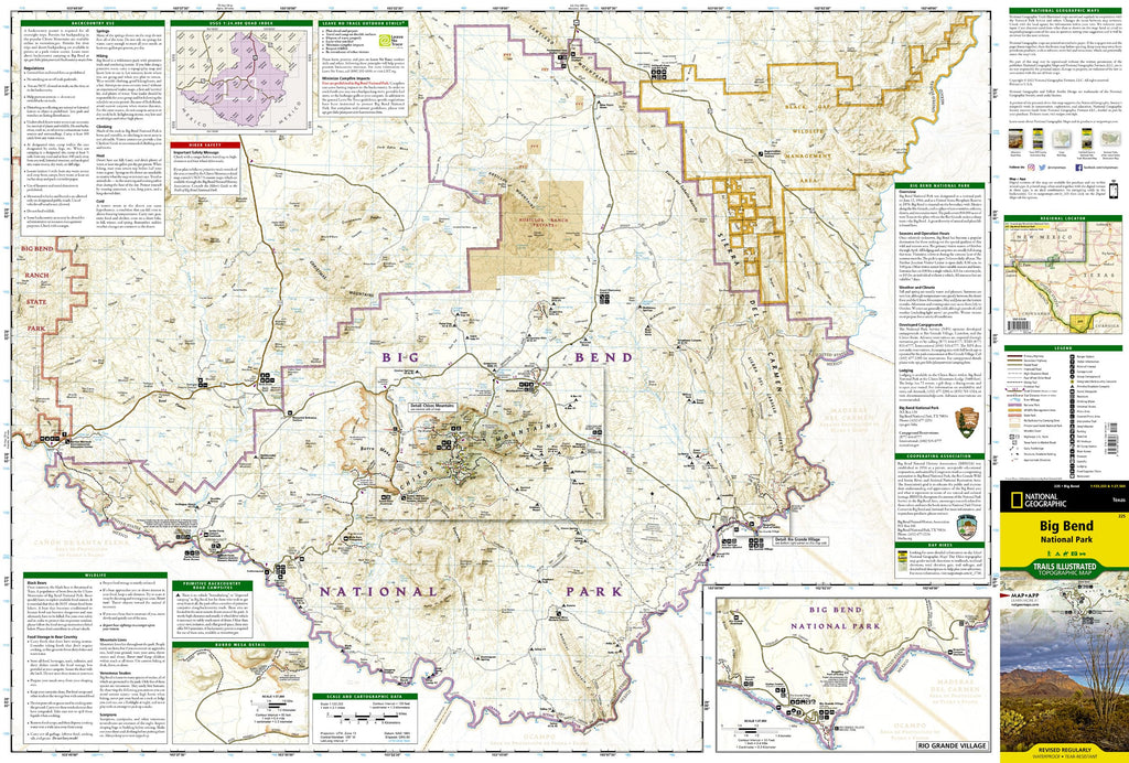 The largest protected area of the Chihuahuan Desert, Big Bend National Park is a remote land of surprising beauty and remarkable biodiversity. Expertly researched and created in partnership with local land management agencies, National Geographic's Trails Illustrated map of Big Bend National Park provides an unparalleled tool for exploring this unique region. This map offers unmatched detail of the entire park including such key areas of interest as Black Gap Wildlife Management Area, Sierra del Carmen, Sierra del Caballo Muerto, and portions of Big Bend Ranch State Park. The print map features detail of the Chisos Mountains, Rio Grande Village, and Burro Mesa.