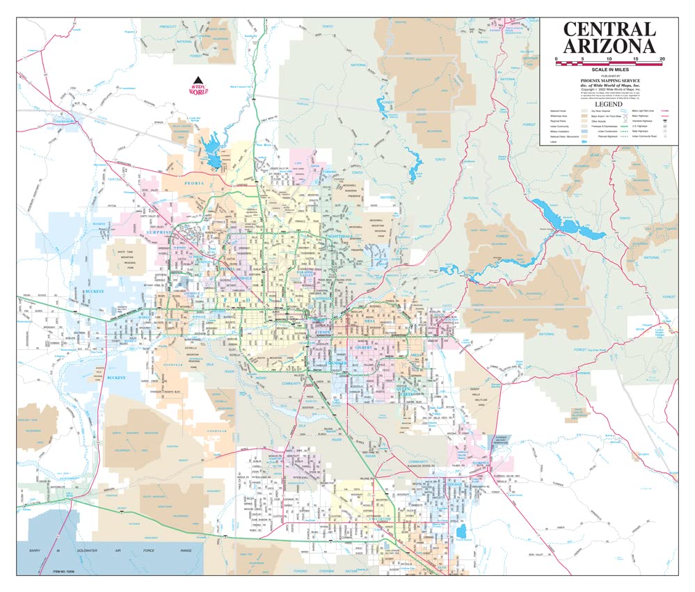 This wall map shows major (arterial) streets, rail and lightrail, and highways for the central region of the State of Arizona. Centered on the Phoenix Metropolitan area, it also shows most of Maricopa, Pinal, and parts of Gila and Yavapai counties. This is the perfect map to plan and track growing commercial markets in this economic hub of the Southwest.