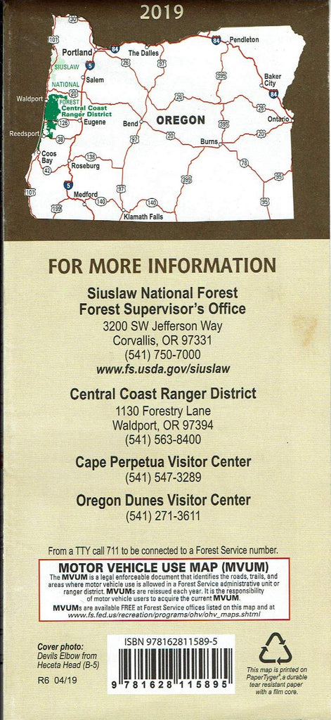This coastal map covers the Siuslaw National Forest's Central Coast Ranger District as well as Oregon Dunes National Recreation Area. The NFS-administered lands located in Oregon's Coastal Region cover several ecosystems, ranging from marshlands and estuaries to dense Douglas fir, hemlock, and cedar forests. Region: synthetic durable weather and tear resistant PaperTyger (looks and feels like regular paper) folded map