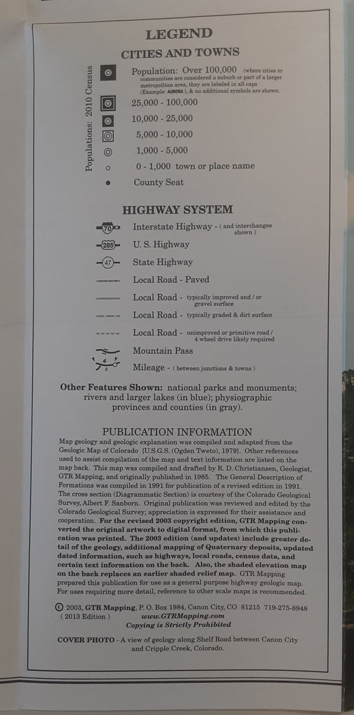 Colorado Geologic Highway Map and Shaded Elevation Map with 14,000 Foot Peaks, Selected Mining Districts, & Dinosaur Localities also includes geologic explanation, description of formations, cross section, and discussion of Colorado's geology, water, & energy & mineral resources.