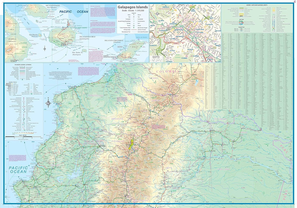 Ecuador is popular with travelers. Not only is it an interesting country and visitor friendly, it is the access point to the Galapagos Islands - one of Earth's treasures. Much of the eastern half of the country is relatively pristine jungle with few roads, although there are numerous resort/jungle lodges in place, particularly along the Rio Napo. These are mostly for adventure travelers, but there are also posadas, haciendas, and excellent hotels throughout the country, and good roads for exploring. Although it would be best for visitors to obtain detailed maps of Quito and of the Galapagos area, this map includes inset maps of central Quito and most of the Galapagos area.