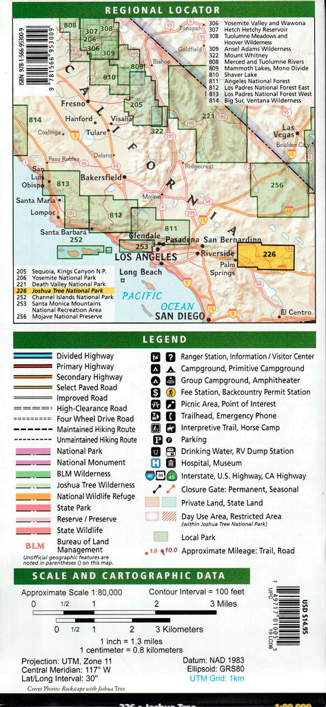 The two distinct ecosystems of the Colorado Desert and the Mojave Desert meet in southeastern California in the Joshua Tree National Park. National Geographic's Trails Illustrated map of the park delivers unmatched detail and valuable information to assist you in your exploration of this fascinating land of surreal geologic features shaped by strong winds, unpredictable torrents of rain, and climatic extremes. Created in partnership with local land management agencies, this expertly researched map features key areas of interest including Black Rock Canyon, Lost Horse Valley, Indian Cove, Cottonwood, Chuckwalla Valley, and the Pinto Mountains.