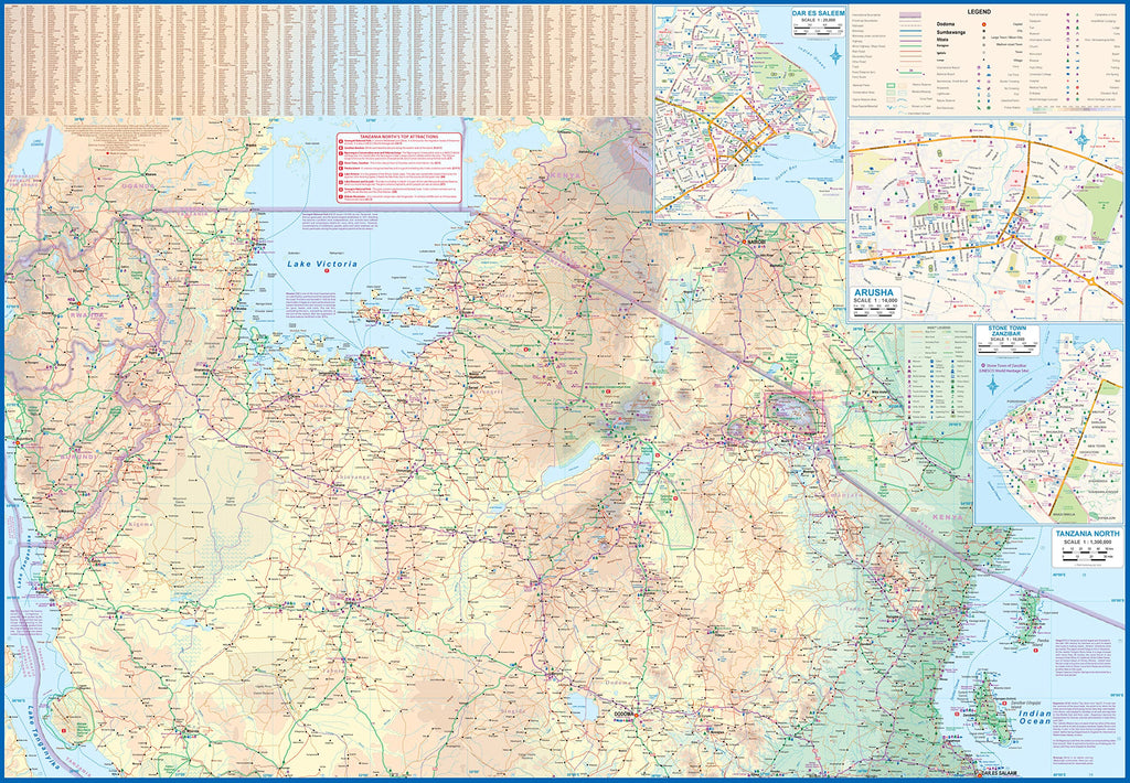 Kili remains eternally popular. This most recent update includes a listing of top attractions for this dormant volcano. The reverse side of the map covers all of northern Tanzania and the portion of Kenya that includes Nairobi. The islands of Pemba and Zanzibar are also shown. This side also includes an inset map of Arusha, the town from which almost all treks to Kilimanjaro begin, an inset of Dar es Salaam, and another of Stone City, in Zanzibar. This map recently won an award from the International Mountaineering Association for excellence.