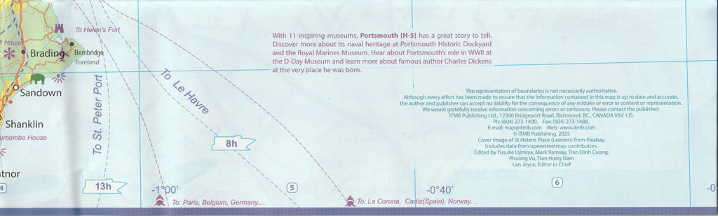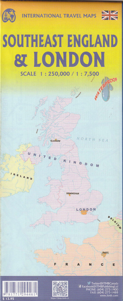 Although the cover picture hasn’t changed, the London map has undergone an extensive revision, adding more hotels, pubs, and attractions. While it is not practical to show all such buildings on a map, we are hoping to achieve a representative sample. The ‘tube’ or underground lines have also been re-drawn and emphasized. Rail lines are shown from their appropriate rail station outwards. There is one north-south rail line through London, and an east-west line under construction, but we are leaving these off our map until the second line is completed. Also, the overground lines are an increasingly important method of travel around London, and these have been shown where appropriate. The big change on this map, and the reason for its new ISBN, is the enhanced and expanded map on the second side of South East England at 1:300,000 scale. This would be ideal for day trips out of London or for those driving. The western edge of the map is Bath and the northern extreme is either Northampton or Cambridge. The main roads in and out of London are shown, with motorways in blue, A roads in green (un-widened A roads in magenta) and thousands of B roads wend their way to lovely villages and secondary towns. Both sides of the map include our Top Attractions list. The map is printed on high-density plastic paper, both for durability and for inclement weather.