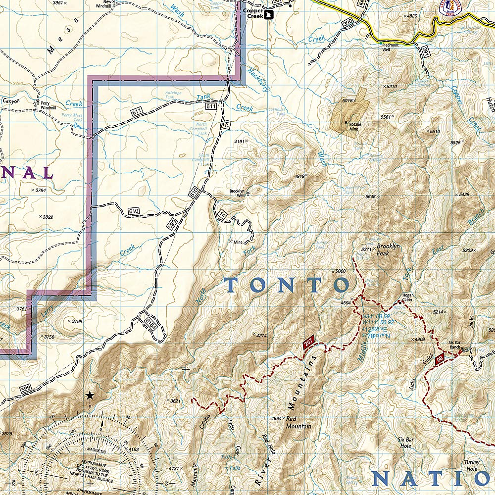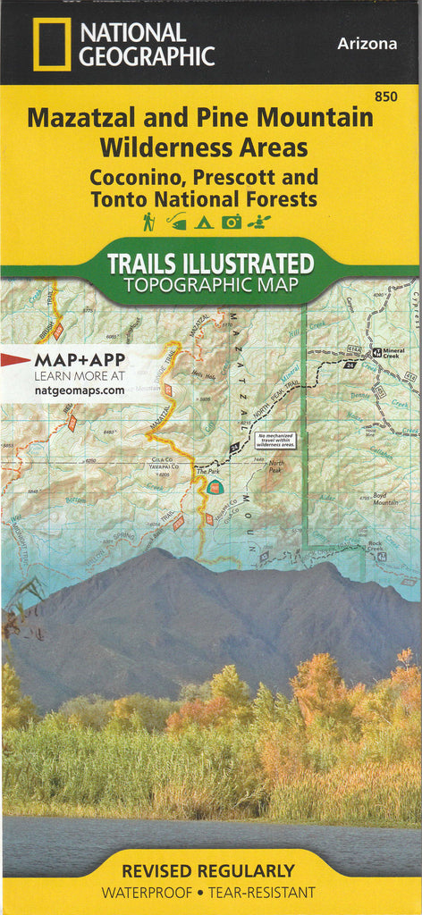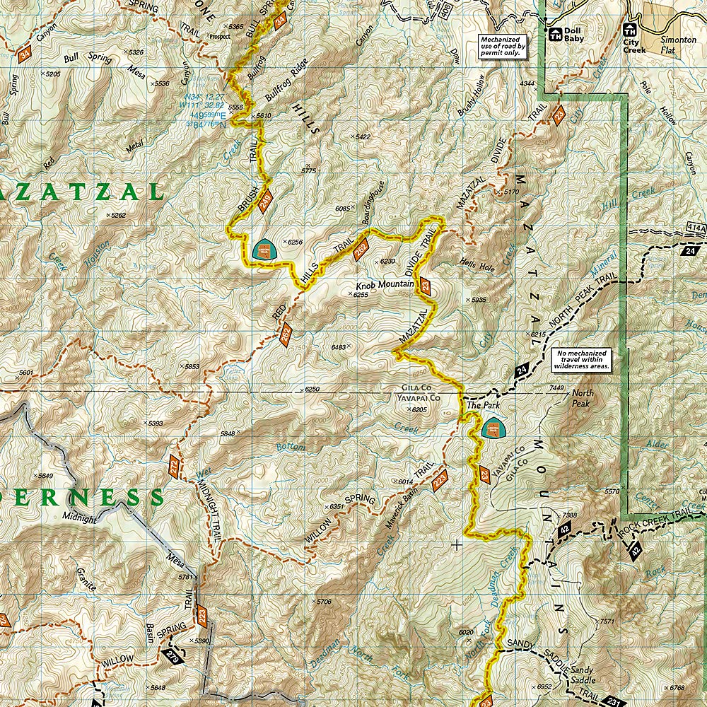 Outdoor enthusiasts looking for recreational opportunities just north of Phoenix, will marvel at National Geographic's Trails Illustrated map of Mazatzal and Pine Mountain Wilderness Areas. Expertly researched and created in cooperation with the U.S. Forest Service, Bureau of Land Management, and others, the map covers these wilderness areas in Coconino, Prescott, and Tonto National Forests with unmatched detail. Some of the region's popular recreation spots detailed include Agua Fria National Monument, Verde Wild and Scenic River, Mogollon Rim, Bartlett and Horseshoe Reservoirs, Mazatzal Peak and Mountains, Spur Cross Ranch Conservation Area, and Tonto Natural Bridge State Park.