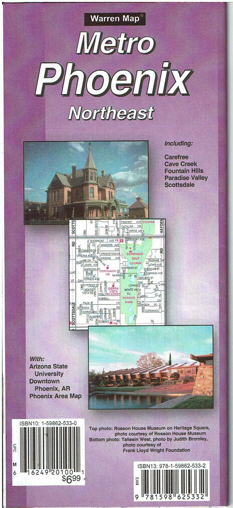 Metro Phoenix Northeast includes up-to-date and easy-to-read full street detail cartography of Carefree, Cave Creek, Fountain Hills, Paradise Valley, and Scottsdale on the primary map plus inset maps of Arizona State University, Downtown Phoenix, and a general Phoenix Area Map.
