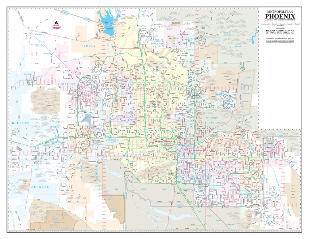 View the entire metropolitan area on a single desktop-sized sheet showing major streets (arterial) and intermediate streets (collector), as well as locating communities, block numbers, river channels, canals, and railways. It is popular for general reference and for locating businesses that are normally found on the arterial and collector streets. The colors are used to show the incorporated cities, making it easy to locate the official area of each city. The grid corresponds to the index in our Phoenix "Yellow1" Street Atlas and other Phoenix Mapping products for easy cross-reference.