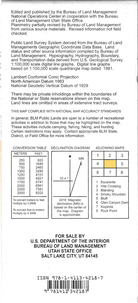 The map shows part of Glen Canyon National Recreation Area with Lake Powell, BLM land to the east, and a part of the Navajo Indian Reservation. Remote areas, map is useful for boaters on Lake Powell in Utah. Official Bureau of Land Management metric topographic map @1:100,000 scale (roughly 3/4"`1 mile), color-coded to show Surface Management/ownership i.e. public vs. private vs. tribal. The map shows roads, water features, recreation sites, points of interest, and township and range lines. Use this map for hunting in the Kaiparowitz and San Juan Units.