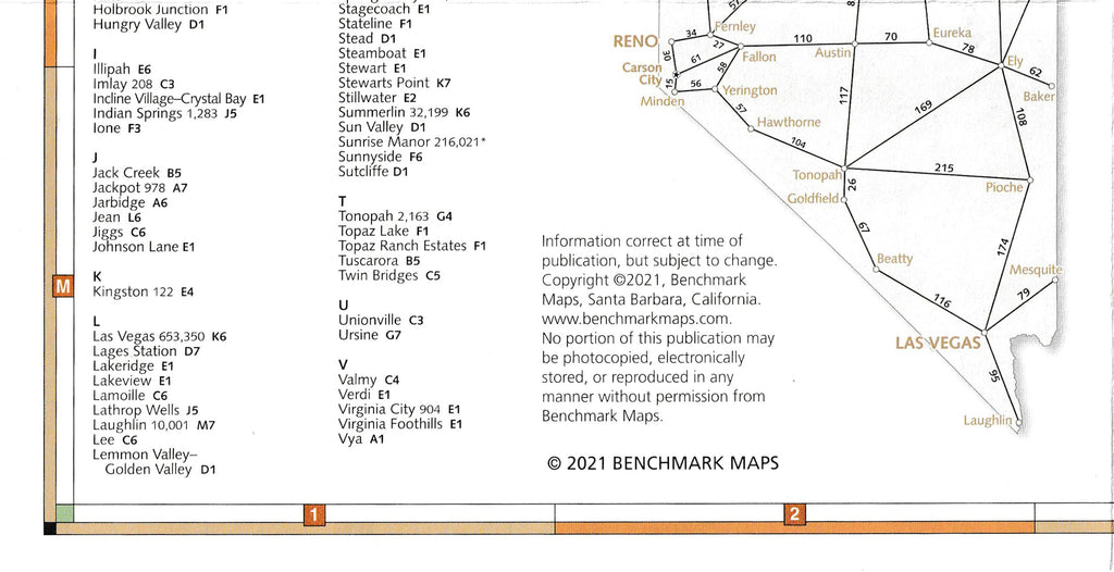 This recreation map of the Silver State is the ideal companion to the Nevada Road & Recreation Atlas. It illustrates statewide road detail and recreation information including public lands, parks and monuments, boating and fishing access, hunting unit boundaries, campgrounds, historic sites, point-to-point distances, and more. The reverse side features categorized listings of recreation points of interest and an inset map of the Lake Tahoe area.