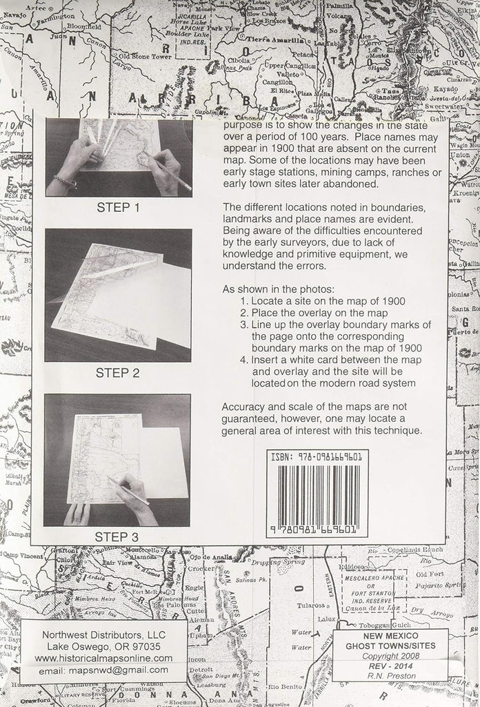 The New Mexico Ghost Towns/Sites package features a transparent overlay printed from a modern New Mexico road system and placed over the four sections of the 1900 map of New Mexico. The purpose is to show the changes in the state over a period of approximately 100 years. Place names may appear on the historical maps but may be absent on the current map. The reader should note that some of the early locations were moved from time to time while others changed their names or simply failed. The reader should be reminded that some of the early place names might have been a post office operated in a ranch house or an early stage station as well as town sites. Some locations were moved from time to time while others changed their names or simply failed.