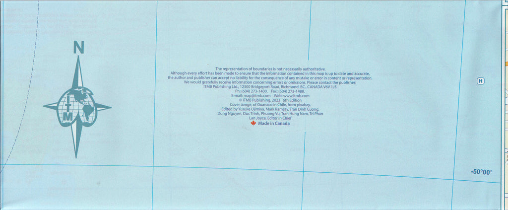 The southern third of South America consists of a mountainous western portion, a vast grassland prairie-like expanse, and a wild southern tip – collectively known as Patagonia. Significant road improvements by both Argentina and Chile in recent years make driving much easier than was the case as recently as 2000. Side 1 covers everything from Bahia Blanca southwards, and side 2 expands the very interesting Tierra del Fuego series of islands to a good advantage. Naturally, Cape Horn is included, as is an inset map of Ushuaia and another of the Falklands. Top attractions are also noted.