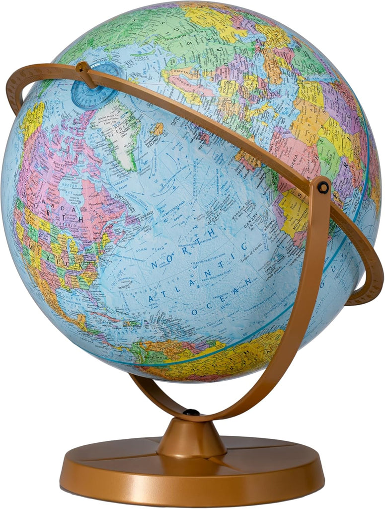 USA Cartography with Raised Mountain Relief and Sturdy Metal Base. Get a closer look at the world, thanks to the gyro-matic mounting that swings up or down to bring any area into closer view. Vivid colors help to easily distinguish political boundaries. Numbered full-meridian and gyro assembly.
