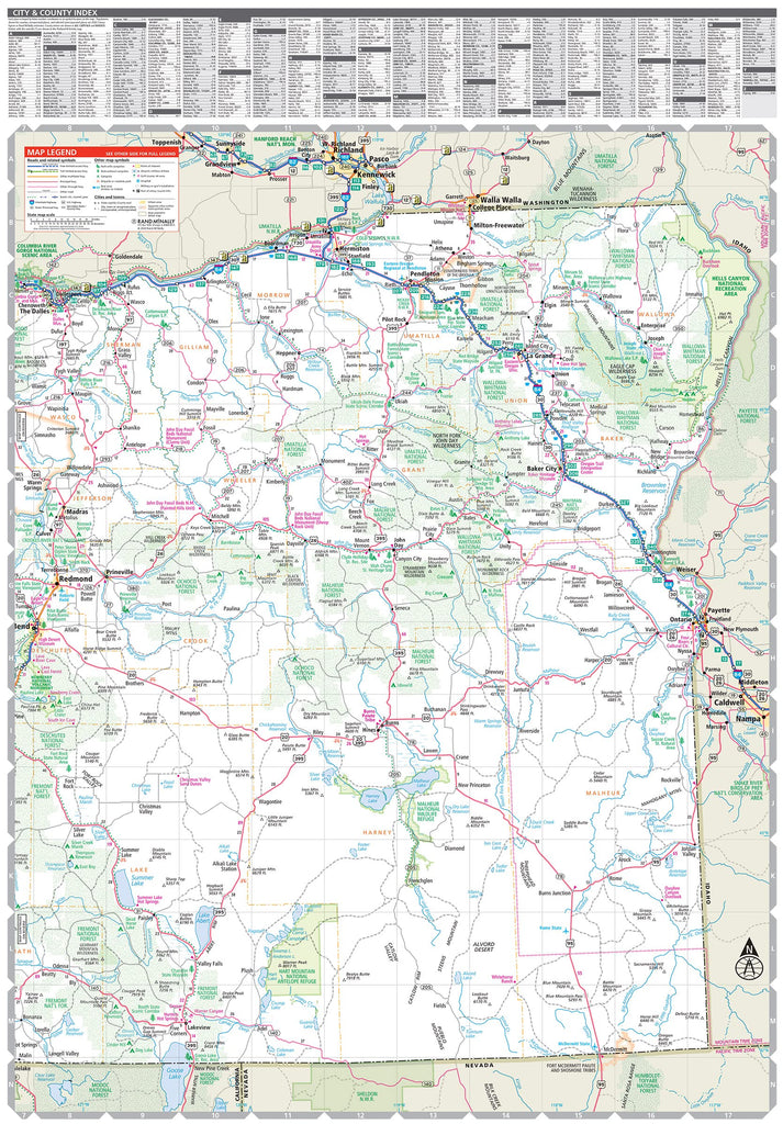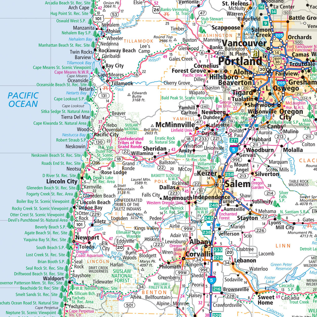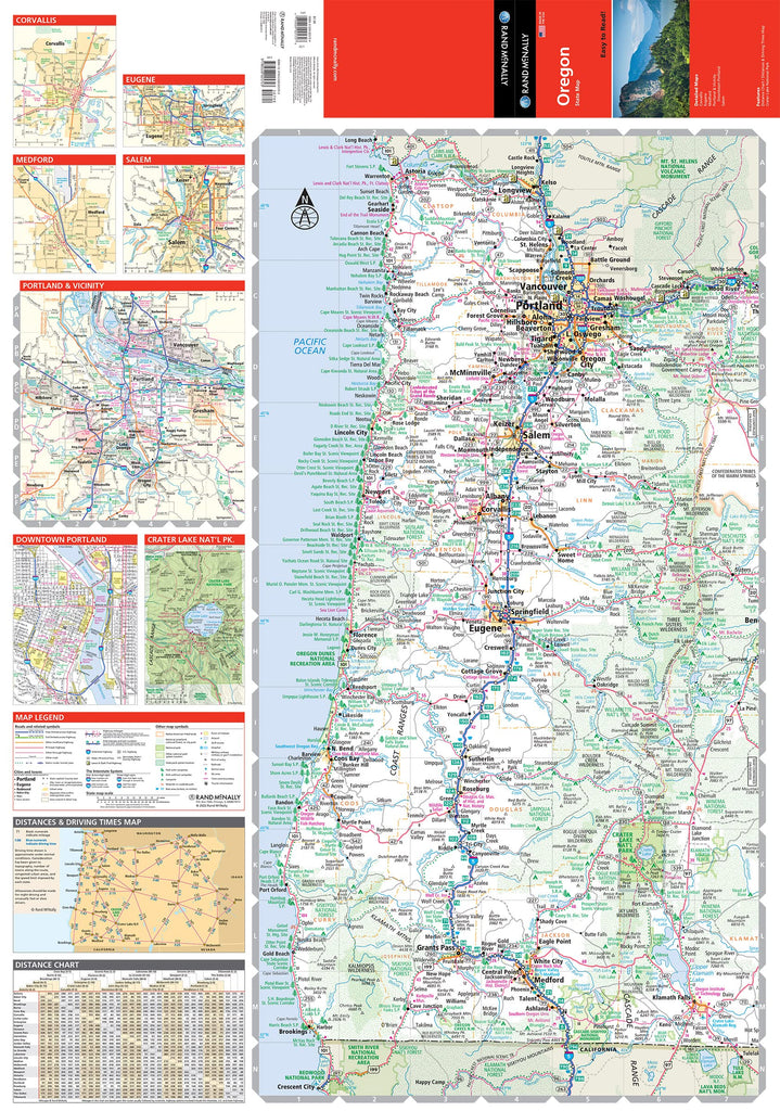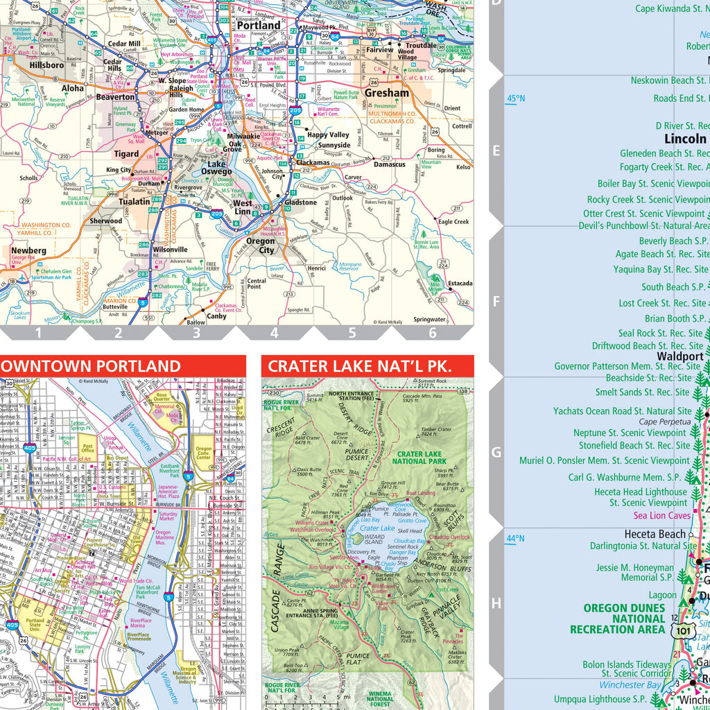 - Detailed maps of: Corvallis, Crater Lake National Park, Eugene, Medford, Portland & Vicinity, Downtown Portland, and Salem