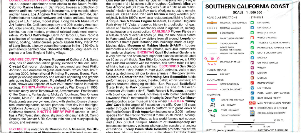 Non-laminated folded paper road map covering highways from San Luis Obispo to Enseneda, Mexico and from Santa Catalina Island to Palm Springs. Features places of interest plus tourist information with text and photos.