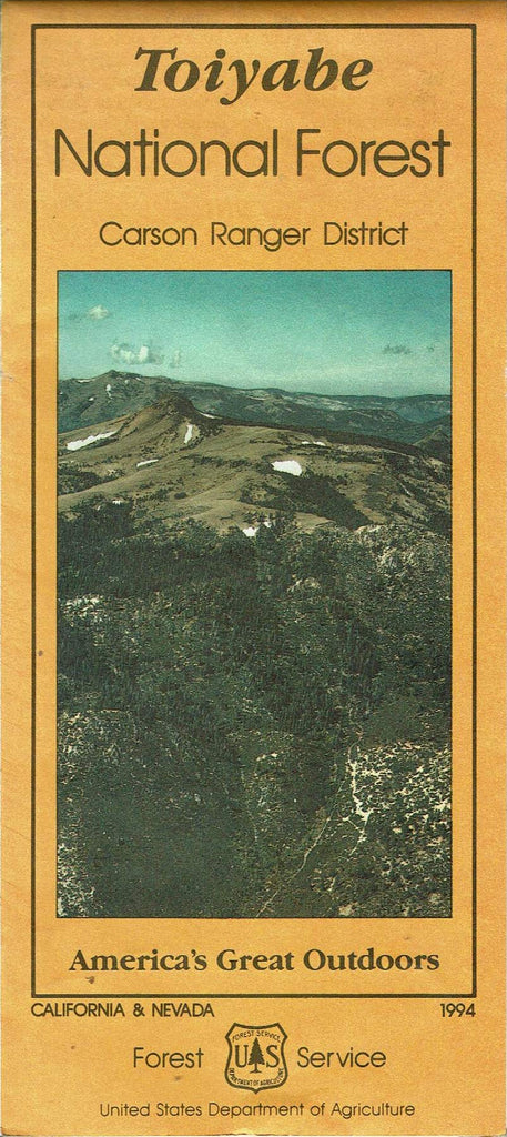 Official Forest Service map of the Toiyabe National Forest Carson Ranger District which extends along the eastern front of the Sierra Nevada Mountains, straddling the Nevada and California border.