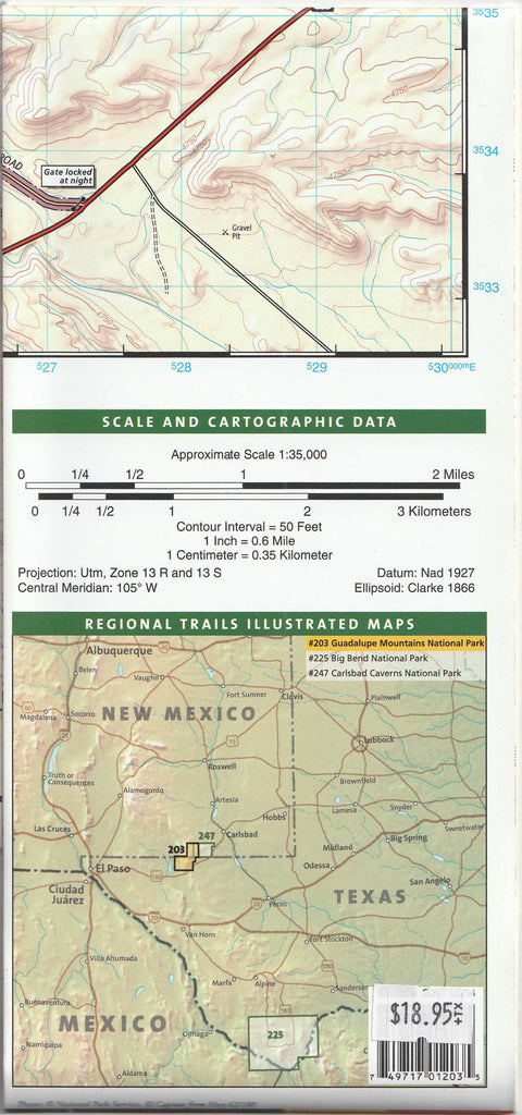 Outdoor enthusiasts will be able to explore the area following precisely mapped trails, which include mileage markers and are color-coded according to their designated usage. Campgrounds, primitive campsites, picnic areas and points of interest along the trails are marked. To aid in your navigation of the area, the map also displays contour lines, elevations, labeled peaks, four-wheel drive and high clearance roads, water features and various waypoints. Additionally a campground to campground mileage chart will help you plans your journey. The map covers map popular points of interest, including Lincoln National Forest, Guadalupe Mountains, and Guadalupe Mountains Wilderness. An inset regional map will assist you accessing the park and the nearby Carlsbad Caverns National Park.