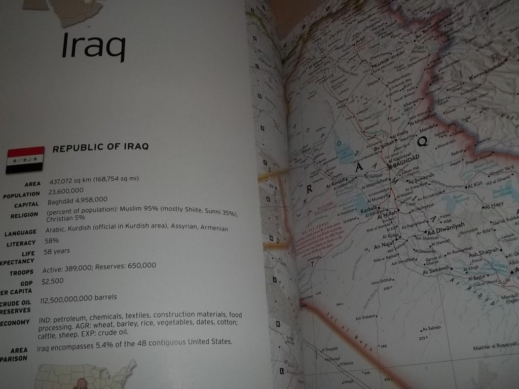 Taken from back dust cover: "With worldwide interest focused on the Middle East, National Geographic has created for the first time a collection of customized maps that help explain and provide context for many of the important issues of this region known for its crossroads of faith and conflict. This conveniently sized, indispensable reference includes: 1) Detailed regional and individual country political maps, 2) Thematic maps and graphs covering vital topics, such as population, religion, oil, water, climate, and languages, 3) Intriguing historical maps, charts, and a time line, 4) Color photographs, satellite imagery, and national and regional flags, 5) Country facts and figures covering literacy, life expectancy, troops, oil reserves, economy, water scarcity, temperature and rainfall, holy sites, religious adherents, ethnic composition, and more."