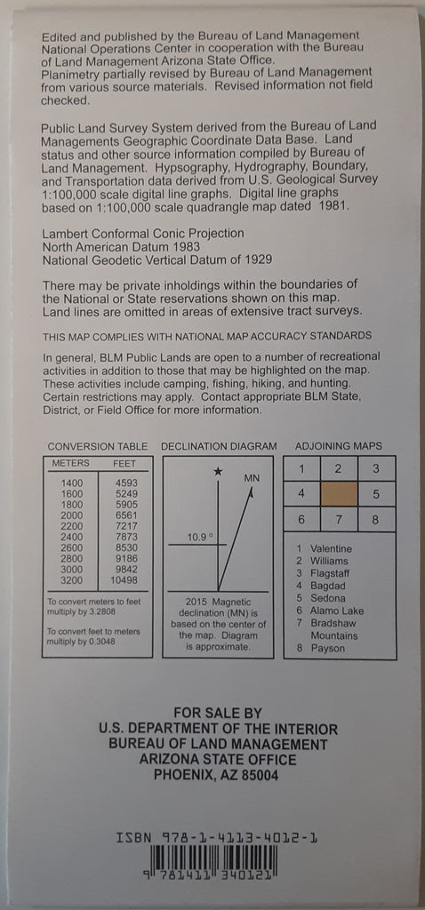 BLM shows roads, national forest lands, campgrounds, hiking trails, and topographic detail. Differentiates between public and private land, and also among the various agencies who manage the public lands. Explore the scenic Prescott National Forest; try camping, hiking, horseback riding, scenic driving, boating and fishing at area lakes, and OHV riding at Alto Pit OHV Area west of Prescott. AZ Hunting Units 8, 17A, 17B, 19A, 19B, and 20A. Scale 1:100,000. 2015