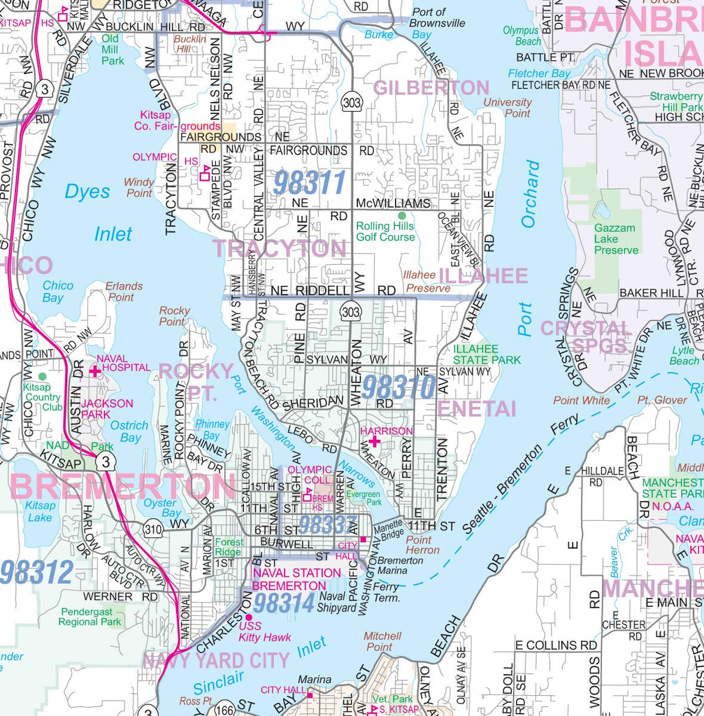 Featuring airports, rail lines (including Sounder, Link, and Amtrak routes), ferry lines. hospitals, colleges, parks, high schools, points of interest (including Boeing facilities and Microsoft HQ, etc), lakes, rivers and landscape features.