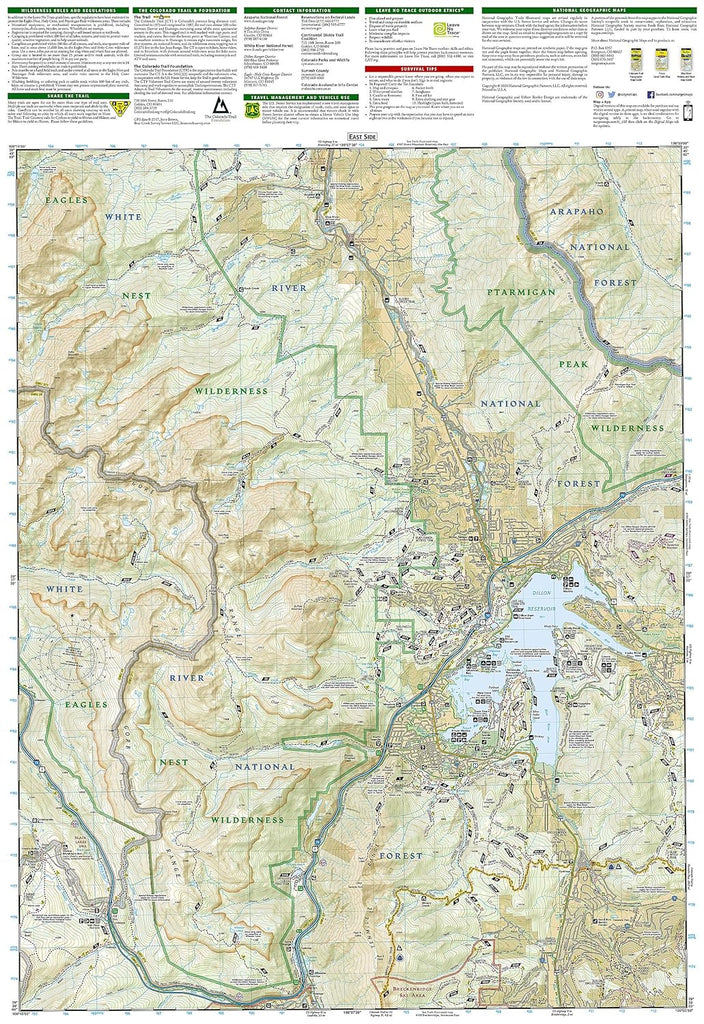 Though best known for winter sports, Vail and its neighboring communities are popular destinations for year-round outdoor recreation. National Geographic's Trails Illustrated map of Vail, Frisco, and Dillon is an unparalleled tool for exploring this region of the Colorado Rockies. Created in partnership with local land management agencies, this expertly researched map delivers unmatched detail and helpful information for experienced outdoor enthusiasts and casual visitors alike. Key areas of interest featured on this map include Dillon Reservoir, Silverthorne, Black Lakes and Blue River state wildlife areas, Eagle River, and Vail Ski Area.